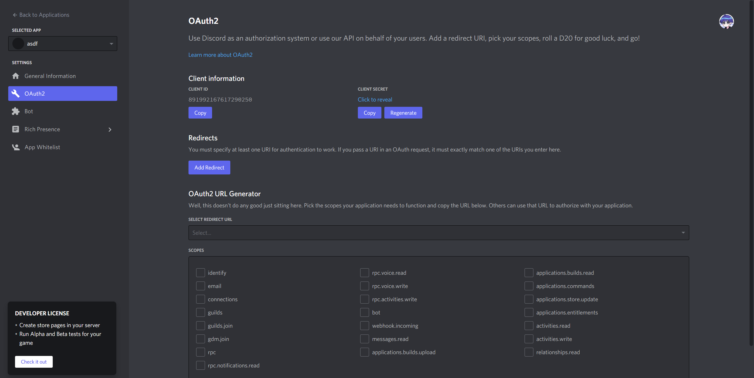 대충 생성해주고 CLIENT ID 복사해주겠습니다. 그리고 scope는 https://discord.com/developers/docs/topics/oauth2#shared-resources-oauth2-scopes